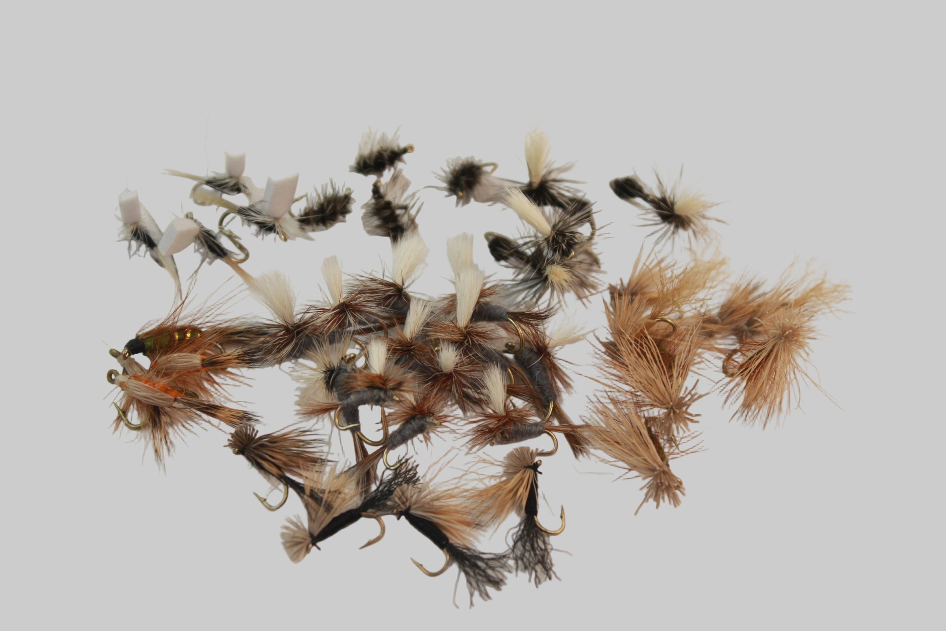 12 Elk Hair Caddis Sizes 14,16,18 (4 each size). 12 Parachute Adams Sizes 14,16,18 (4 each size). 4 Griffiths Gnats Sizes 18,20 (2 each size). 4 Parachute Ants Sizes 14,16 (2 of each size) 4 CDC Foam Emergers Sizes 16,18 (2 each size). 4 Tied Down Caddis Sizes 14,16 (2 of each size)